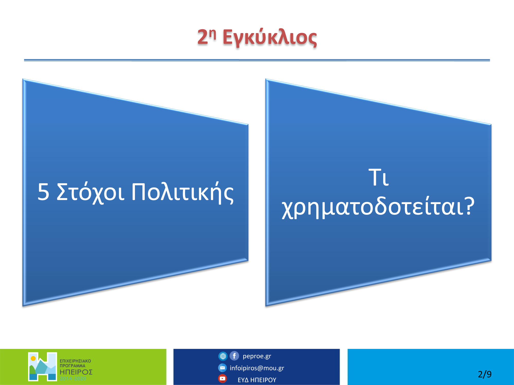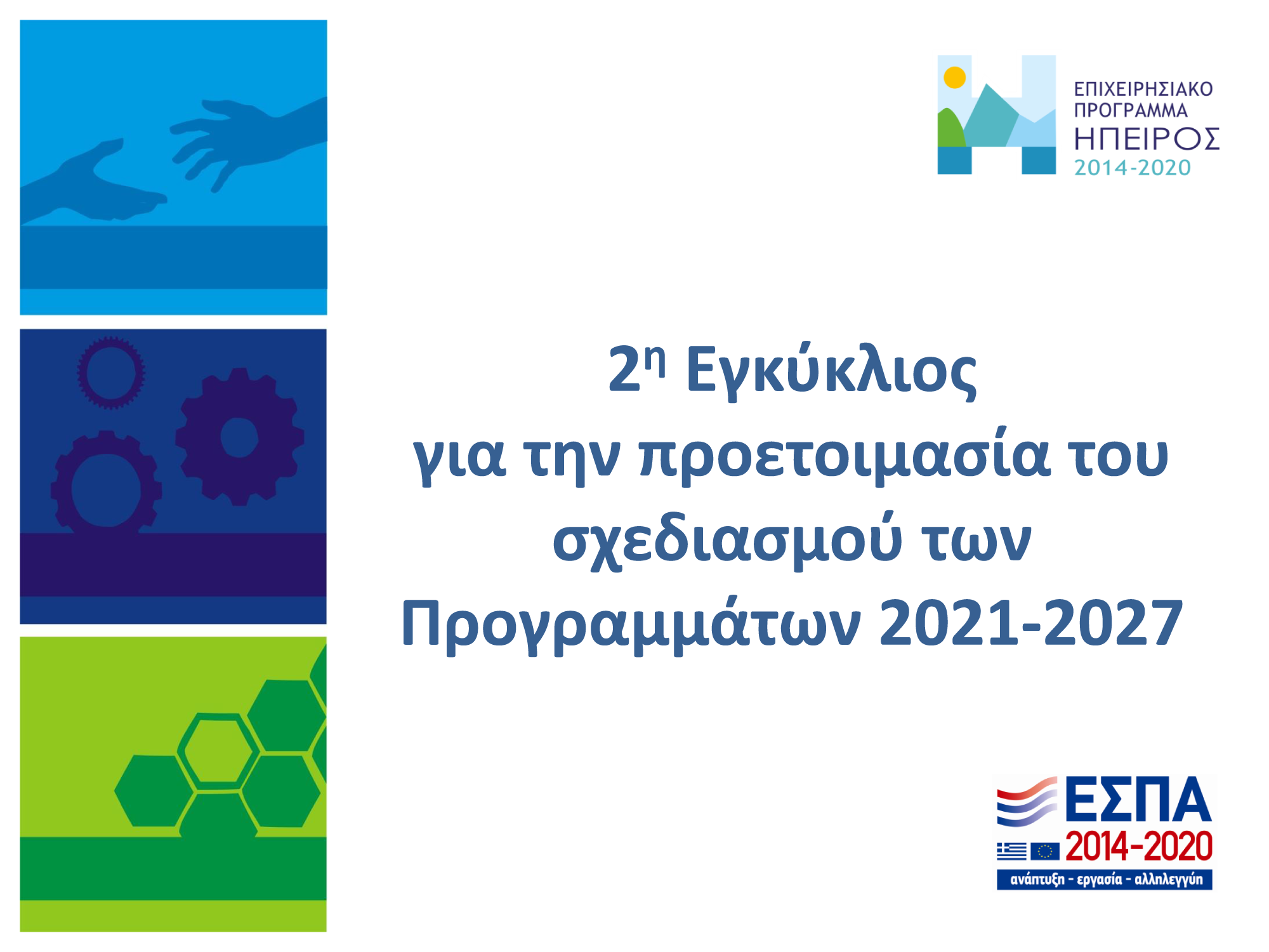 2η ΕγκύκλιοςΗ 2η Εγκύκλιος που περιέχει τις βασικές αρχές που θα διέπουν τη δομή και το περιεχόμενο των προγραμμάτων της Προγραμματικής Περιόδου 2021-2027 που θα χρηματοδοτηθούν από το Ευρωπαϊκό Ταμείο Περιφερειακής Ανάπτυξης (ΕΤΠΑ), το Ταμείο Συνοχής (ΤΣ), το Ευρωπαϊκό Κοινωνικό Ταμείο + (ΕΚΤ+), το Ταμείο Δίκαιης Μετάβασης (ΤΔΜ) και το Ευρωπαϊκό Ταμείο Θάλασσας και Αλιείας (ΕΤΘΑ).