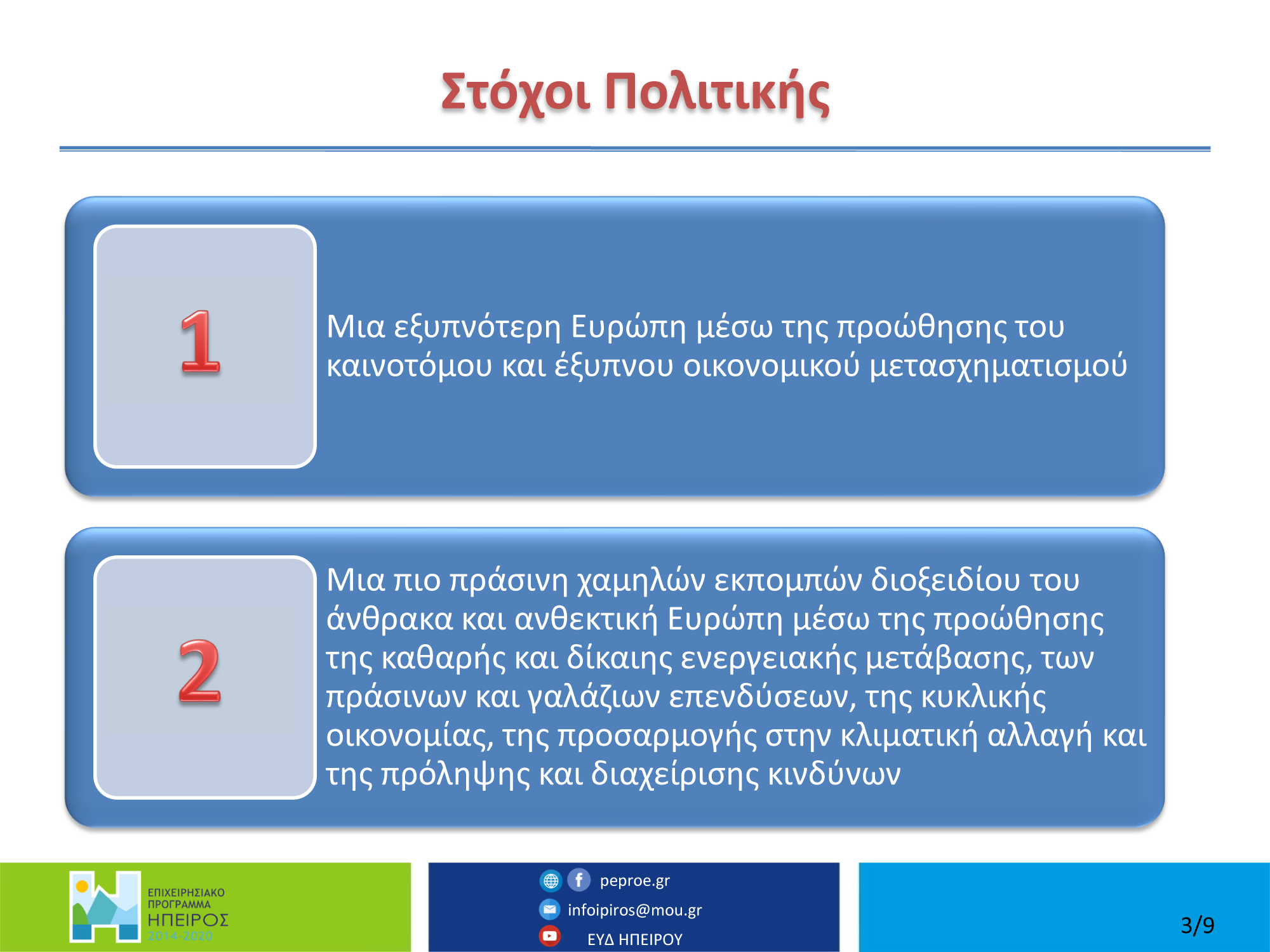 Στόχος Πολιτικής 2: Μια πιο πράσινη Ευρώπη με χαμηλές εκπομπές διοξειδίου του άνθρακα μέσω της προώθησης της δίκαιης μετάβασης σε καθαρές μορφές ενέργειας, των πράσινων και γαλάζιων επενδύσεων, της κυκλικής οικονομίας, της προσαρμογής στην κλιματική αλλαγή, της πρόληψης και της διαχείρισης των κινδύνωνΟ στόχος αποσκοπεί στη δημιουργία μιας πιο πράσινης Ελλάδας και Ευρώπης με χαμηλές εκπομπές άνθρακα μέσω της προώθησης μέτρων ενεργειακής απόδοσης, της προαγωγής των ανανεώσιμων πηγών ενέργειας, της ανάπτυξης έξυπνων ενεργειακών συστημάτων, δικτύων και εξοπλισμού αποθήκευσης, της ορθολογικής και βιώσιμης διαχείρισης των υδάτινων πόρων, της κυκλικής οικονομίας, της προσαρμογής στην κλιματική αλλαγή, της πρόληψης και της διαχείρισης των κινδύνων, καθώς και της ενίσχυσης της βιοποικιλότητας, των πράσινων υποδομών στο αστικό περιβάλλον και της μείωσης της ρύπανσης.